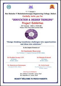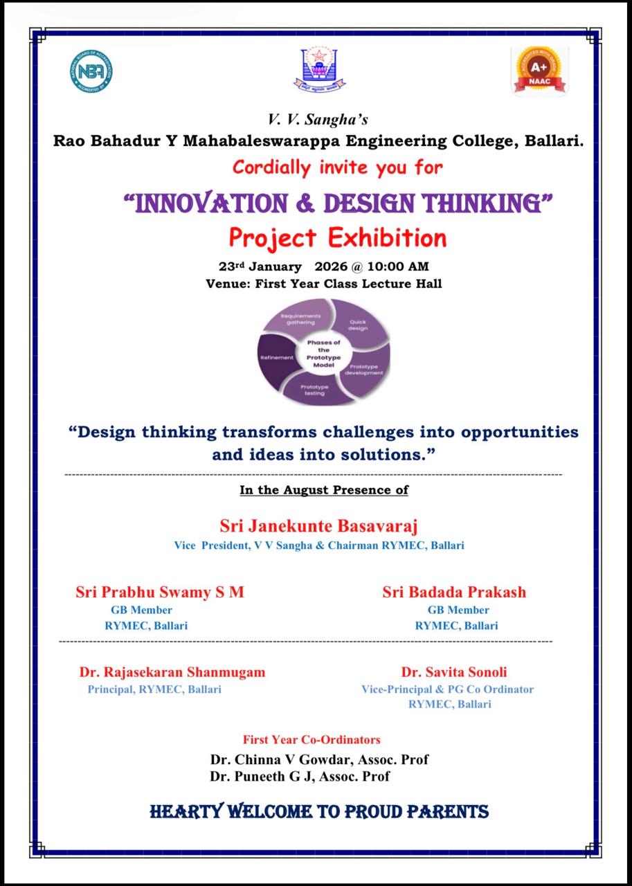 The Innovation Design Thinking Project Exhibition – 2026 was organized on 23rd January 2026 at 10:00 AM as part of the academic initiative under the Visvesvaraya Technological University (VTU) curriculum. The event aimed to provide a platform for first-year engineering students to showcase their creativity, technical knowledge, and problem-solving abilities through innovative project prototypes. In today’s rapidly evolving technological landscape, it is essential for students to move beyond theoretical learning and engage in practical, application-oriented activities. Design thinking plays a crucial role in fostering innovation by encouraging students to empathize with real-world problems, ideate solutions, develop prototypes, and evaluate their effectiveness. This exhibition served as a significant step toward nurturing such competencies among budding engineers while creating an environment of collaboration and experiential learning.